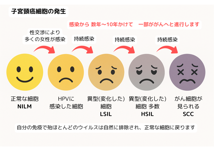 大半は免疫によって自然に消えますが、約10%は持続感染となり、数年をかけてがん化することがあります。