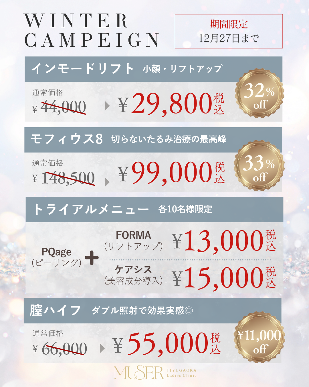 効果は、お顔のHIFUと同様に2週間〜1ヶ月程度でご実感いただけるため、花粉症のくしゃみによる尿もれが心配な方にも間に合います。満足度の高い施術ですので、この機会にぜひお受けください。