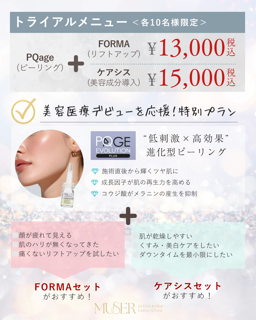PQage(ピーリング)+FORMA(高周波リフトアップ) ¥13,000(税込) PQage(ピーリング)+ケアシス(エレクトロポレーション) ¥15,000(税込)