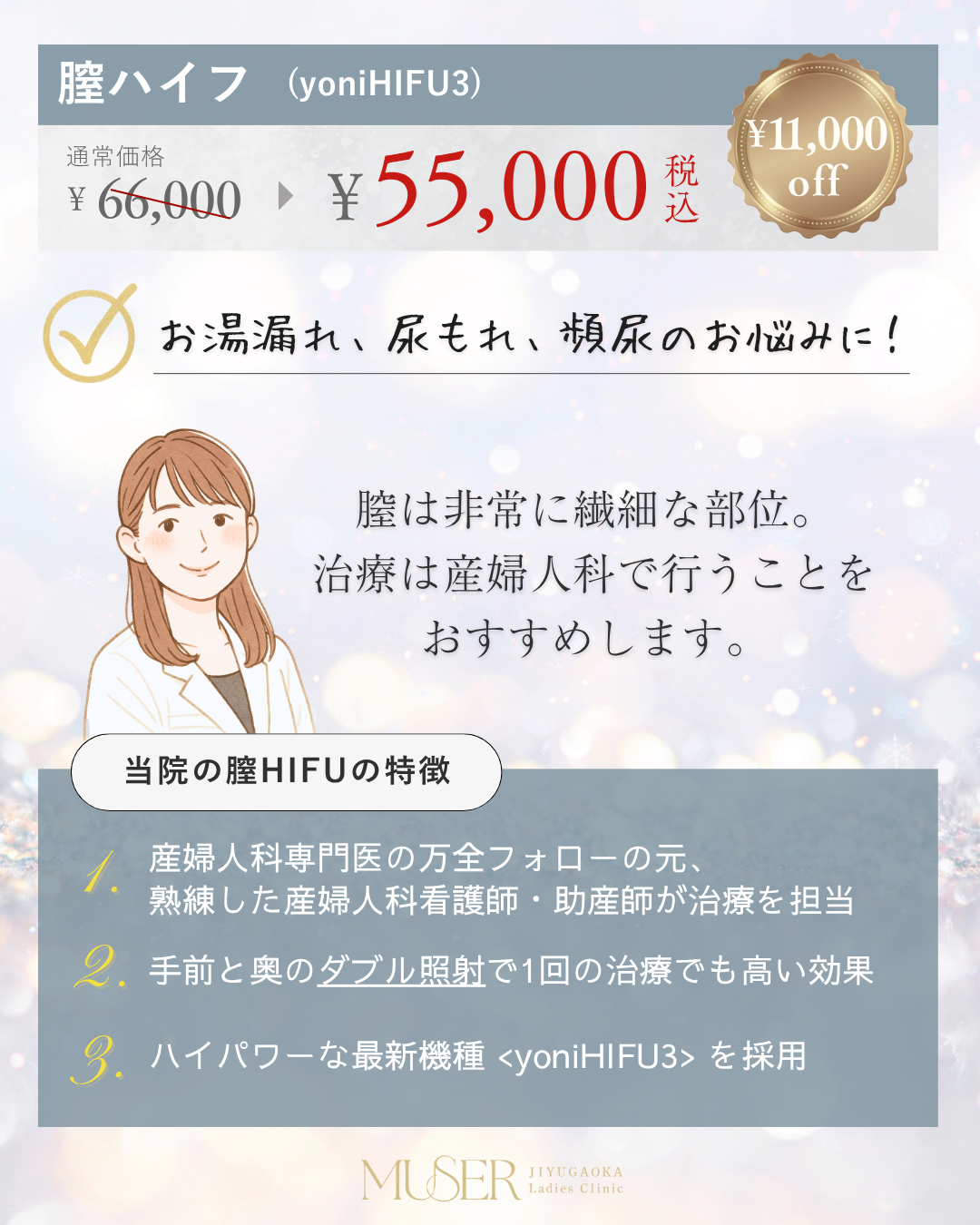 腟ハイフ yoniHIFUⅢ 尿もれ、頻尿、お湯もれのお悩みに 当院が自信をもっておすすめします!