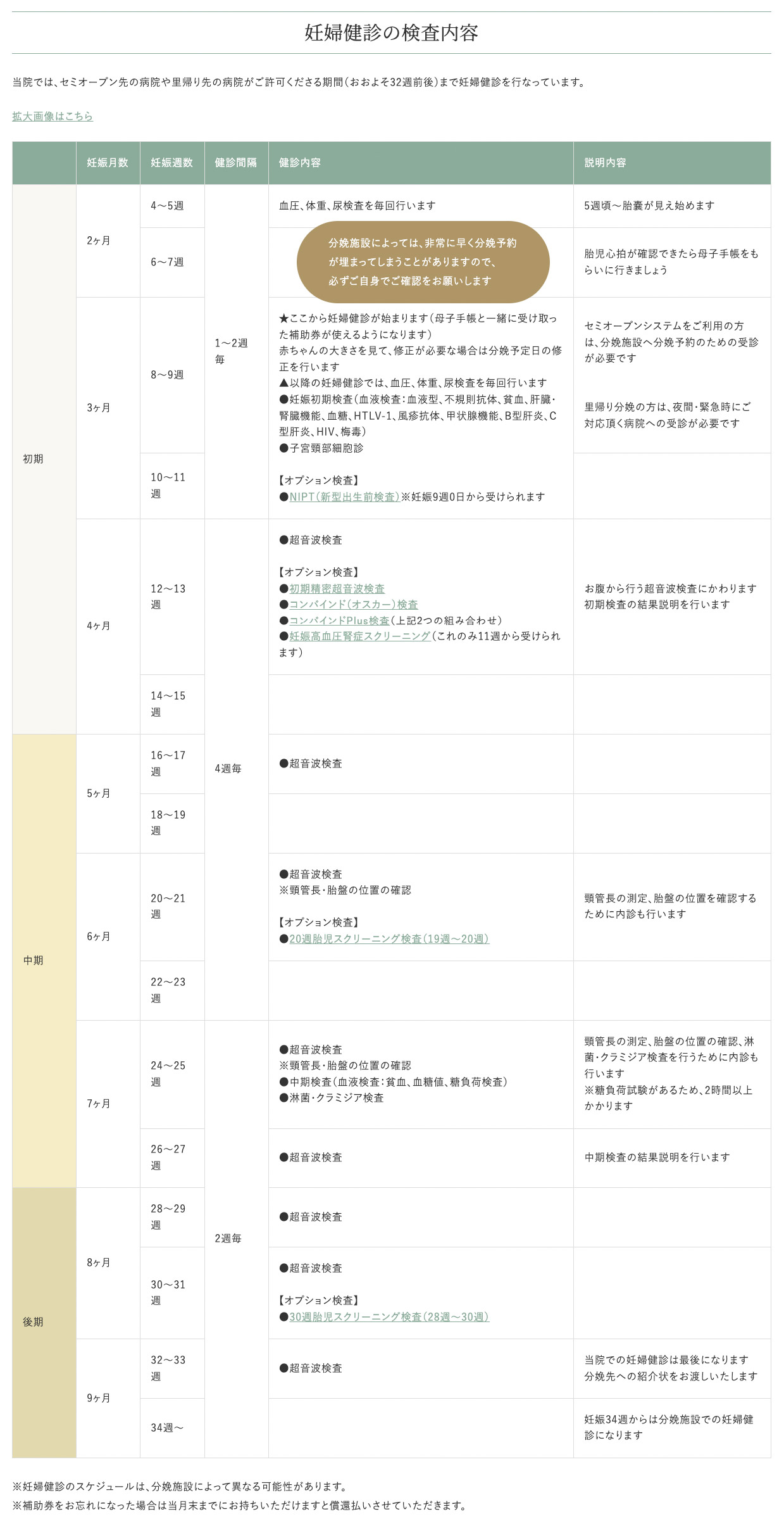 | 34週〜 | 妊娠34週からは分娩施設での妊婦健診になります |